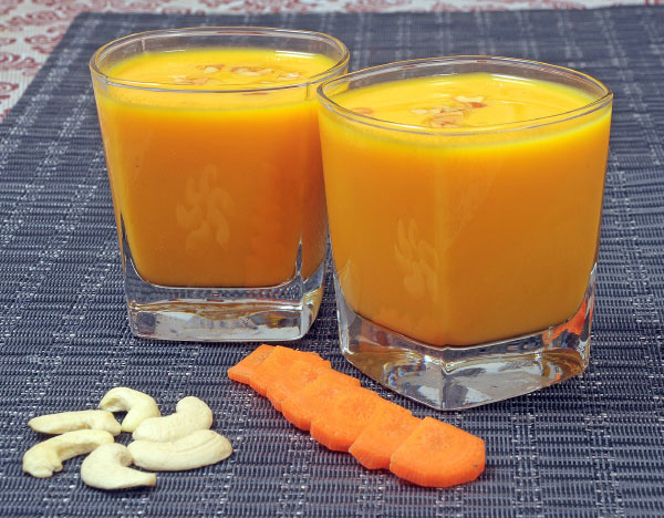 பாலைக் காய்ச்சி ஆறவைத்துக்கொள்ளவும். முந்திரியை நெய்யில் வறுத்துக்கொள்ளவும். கேரட்டை தோல் சீவி பெரிய துண்டுகளாக நறுக்கி, குக்கரில் வேகவைத்து அதன் தண்ணீரை வடித்து தனியே எடுத்து வைக்கவும். கேரட் ஆறியதும் வடித்த தண்ணீருடன் சேர்த்து மிக்ஸியில் மையாக அரைக்கவும். அடுப்பில் கனமான அடிப்பகுதியுள்ள பாத்திரத்தை வைத்து அரைத்த கேரட் விழுது சேர்க்கவும். இத்துடன் சர்க்கரை சேர்த்து கரையும் வரை நன்றாகக் கிளறி விடவும். பிறகு காய்ச்சிய பால், ரோஸ் எசன்ஸ் சேர்த்துக் கலக்கி முந்திரி சேர்த்து இறக்கவும். இதை சூடாகவோ அல்லது ஃப்ரிட்ஜில் வைத்து சில்லென்றோ பரிமாறவும்